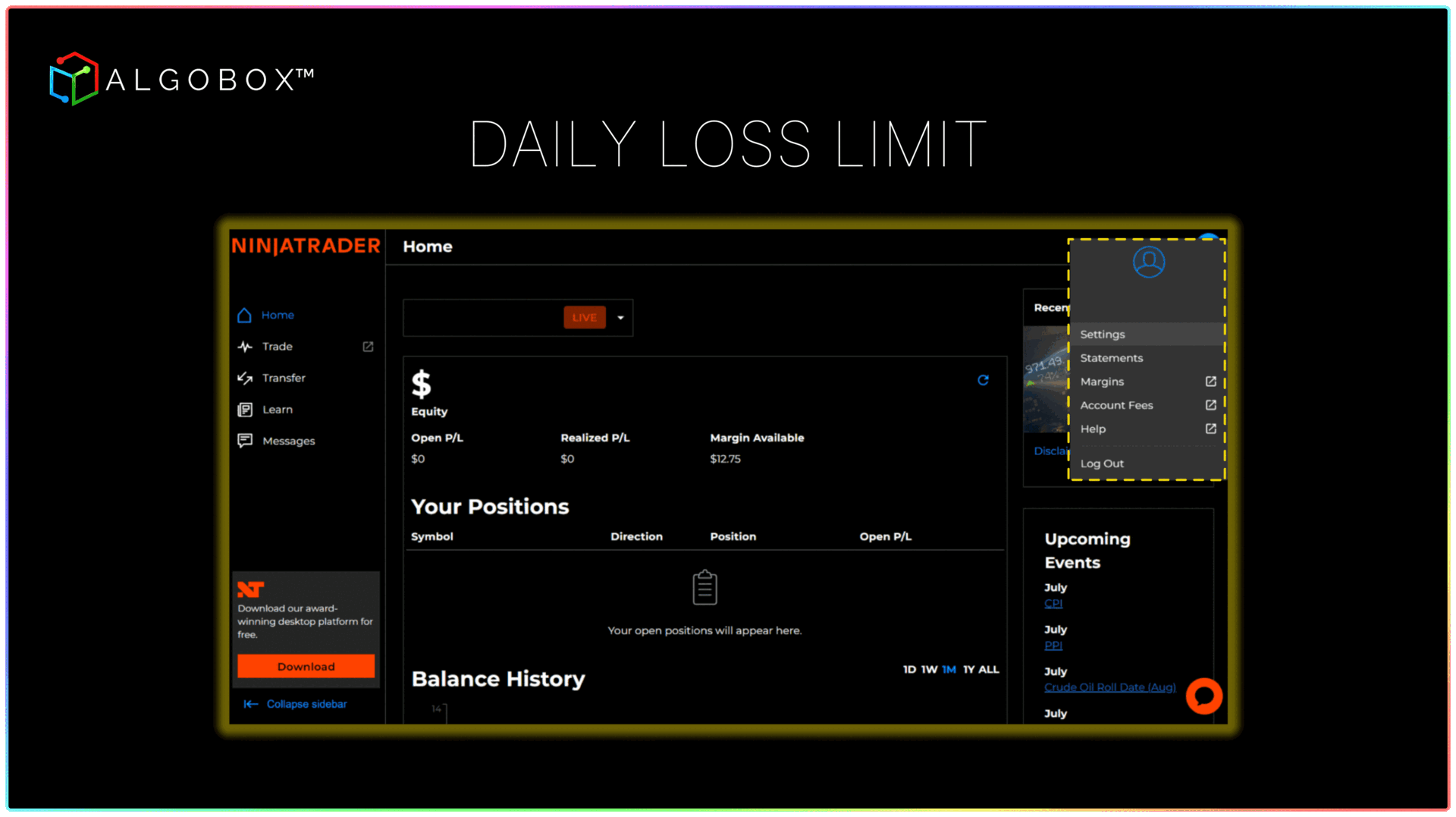 <figure><img src="https://3588932008-files.gitbook.io/~/files/v0/b/gitbook-x-prod.appspot.com/o/spaces%2FSmdQdlKTkpiw2LN0L1TV%2Fuploads%2Fpm8imrXq8qmho0tsuVEK%2FDaily%20Loss%20Limit%201%20GIF.gif?alt=media&#x26;token=493a60e8-4689-4997-99e3-5b188914a03a" alt=""><figcaption><p>Log in to your NinjaTrader brokerage account, navigate to the blue icon in the upper right-hand corner and click on "Settings."</p></figcaption></figure>
