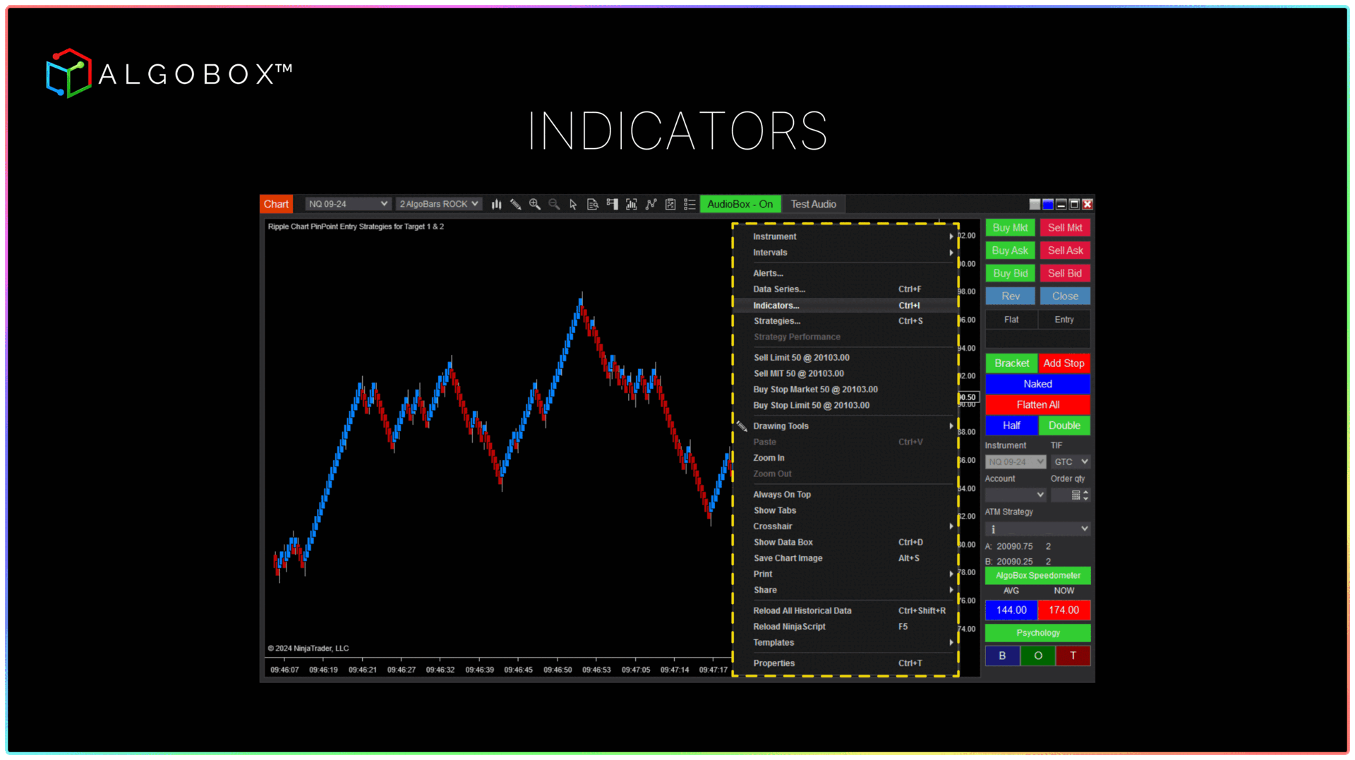 You can add or remove AlgoBox™ indicators on your NinjaTrader charts for a personalized experience. Right-click on your desired chart and select "Indicators."