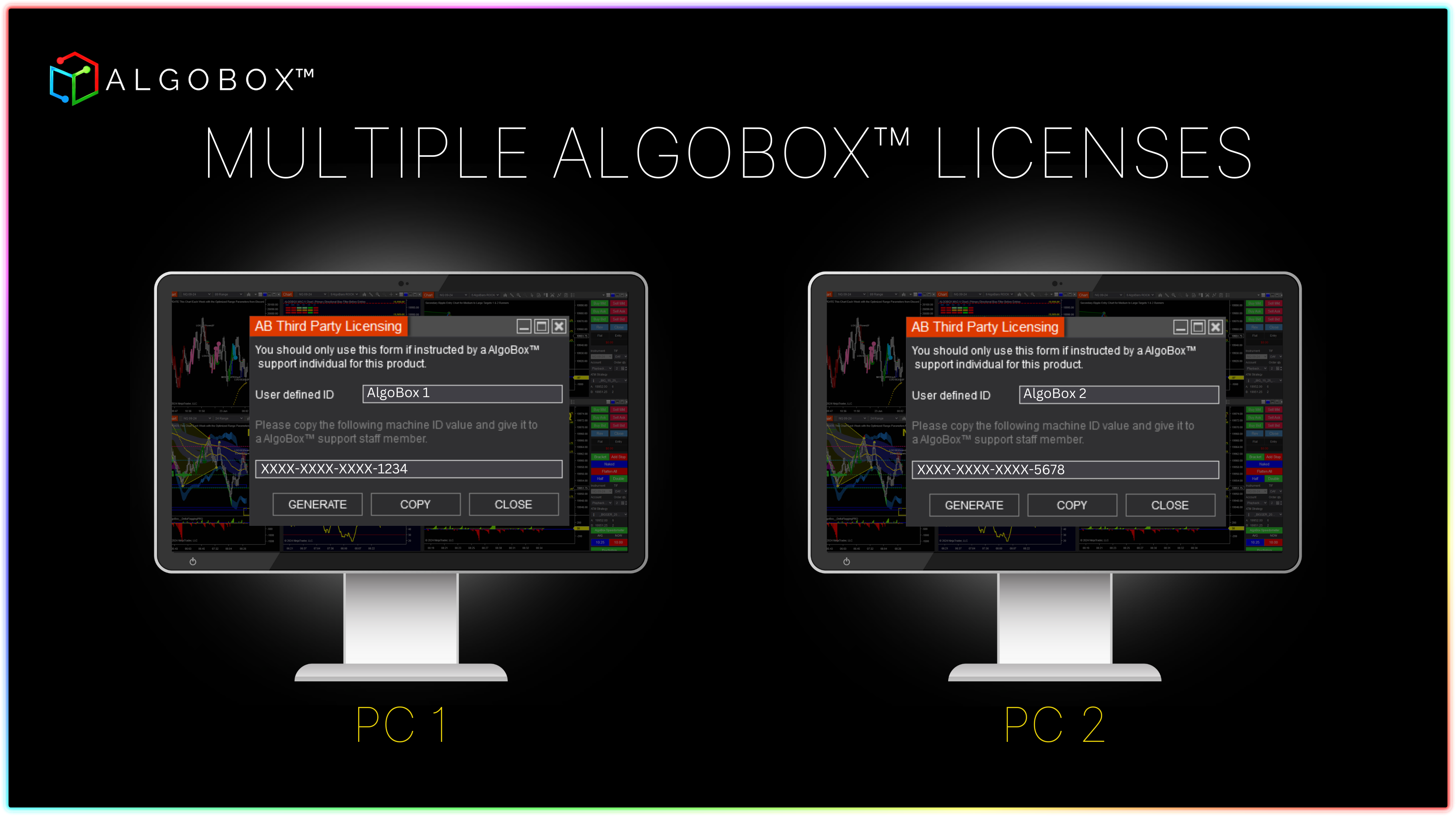<figure><img src="https://3588932008-files.gitbook.io/~/files/v0/b/gitbook-x-prod.appspot.com/o/spaces%2FSmdQdlKTkpiw2LN0L1TV%2Fuploads%2FBGct3WUPfPzgGn1zyzxM%2FMultiple%20PCs%20Licenses.png?alt=media&#x26;token=2d39be5b-a9df-490b-9b53-68a3bedd8af0" alt=""><figcaption><p>If you use more than one trading machine, you can purchase additional AlgoBox™ licenses at a discount to ensure compliance with our licensing agreement. Join our free <a href="https://discord.gg/algobox">Discord</a> for details.</p></figcaption></figure>
