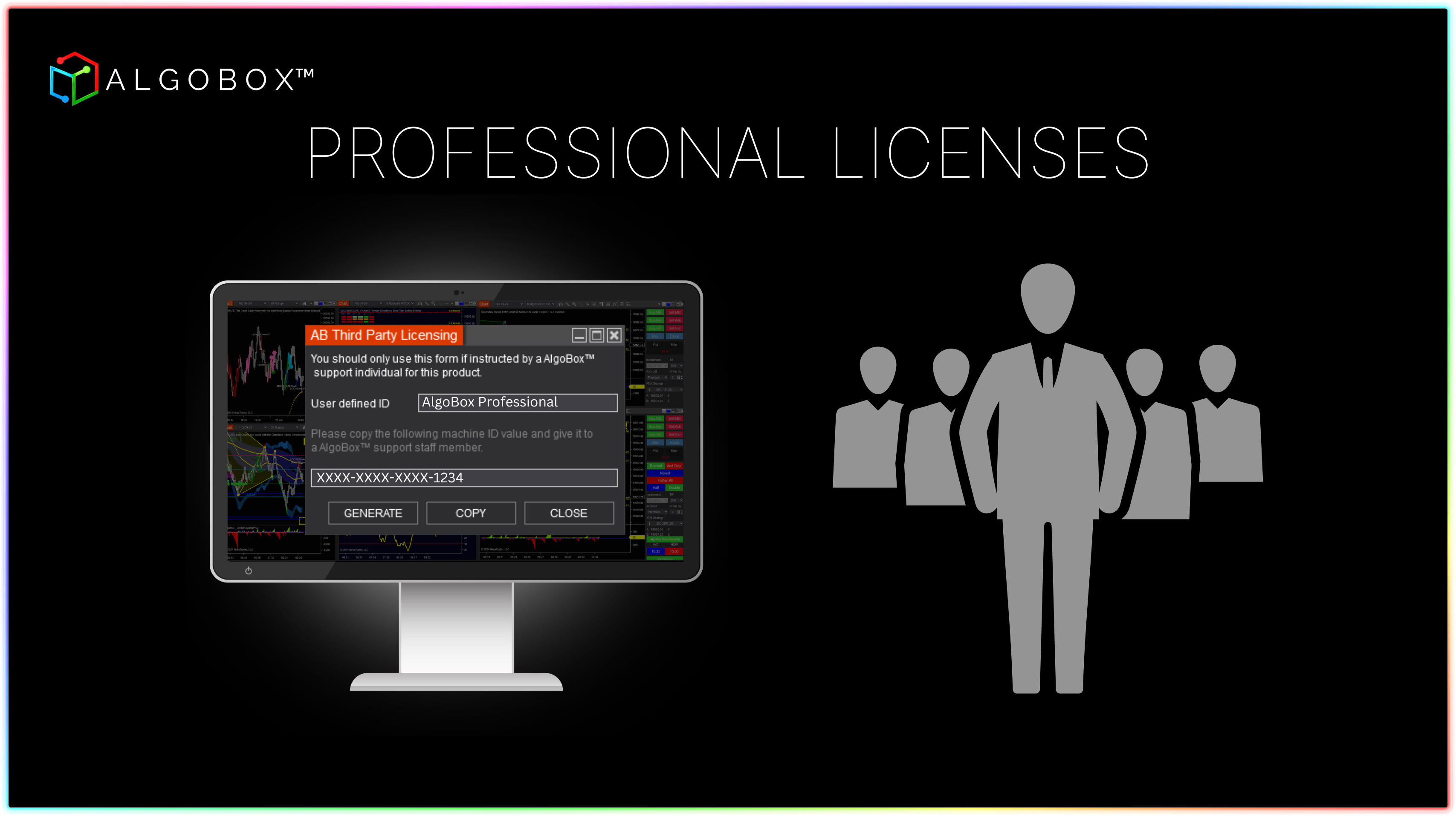 <figure><img src="https://3588932008-files.gitbook.io/~/files/v0/b/gitbook-x-prod.appspot.com/o/spaces%2FSmdQdlKTkpiw2LN0L1TV%2Fuploads%2FgGxUoraySArmMnpWnBPo%2Fmultiple%20PCs%20Pro%20Licenses.png?alt=media&#x26;token=b174ab48-425c-4ce2-8307-fa739d5dd7dc" alt=""><figcaption><p>The AlgoBox™ Professional License is for any individual or entity whose work involves financial markets. This includes but is not limited to those using AlgoBox™ for business purposes (e.g. streaming, influencing, advising, consulting etc.) and those employed by financial institutions such as banks, hedge funds, and investment/prop firms etc. Join our free <a href="https://discord.gg/algobox">Discord</a> for more details.</p></figcaption></figure>