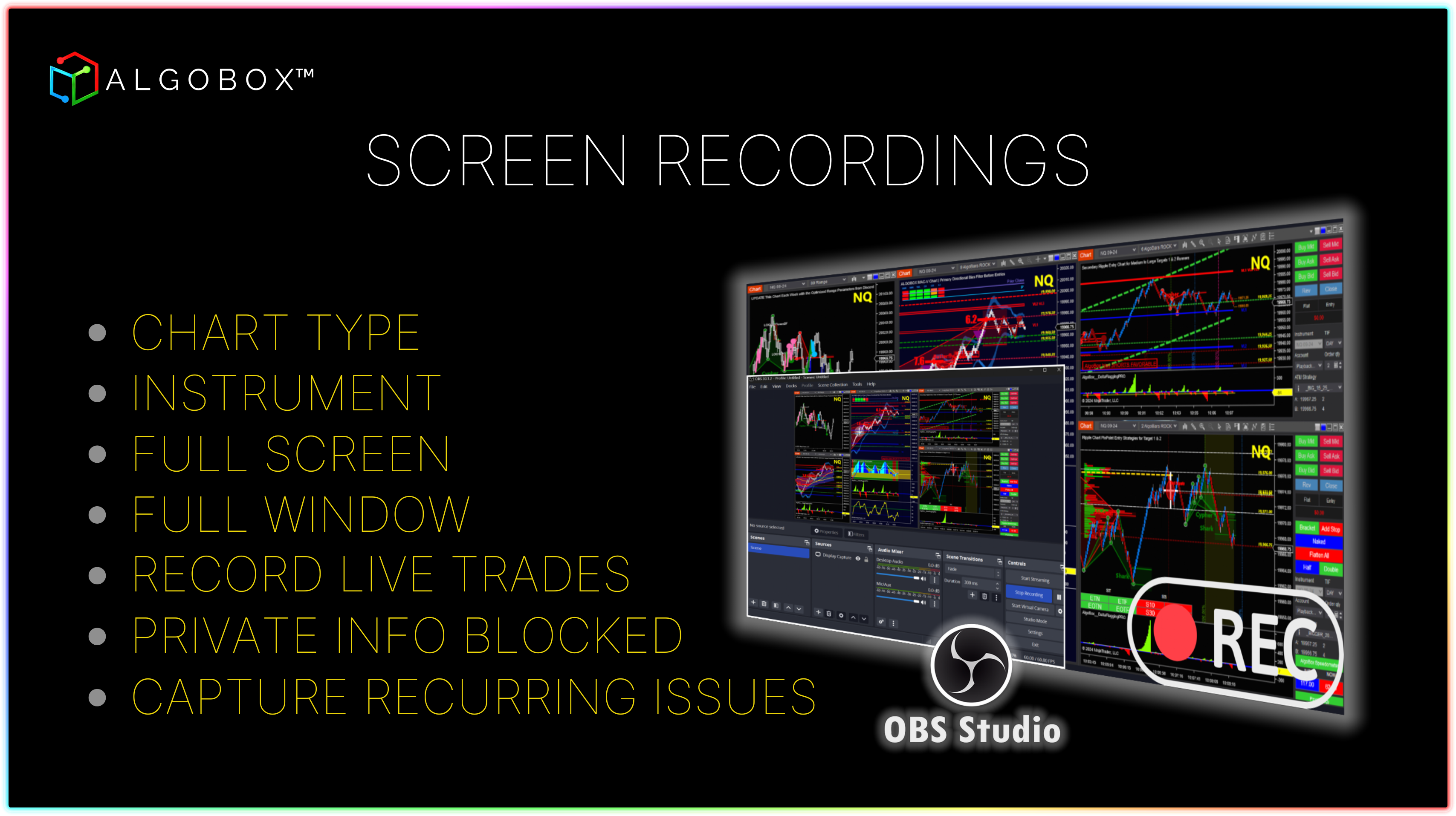 Taking proper screenshots and screen recordings are crucial for studying your own performance, explaining issues, and sharing trading ideas. Posting proper screenshots in [Discord](https://discord.gg/algobox) is critical to your learning process as it prevents unnecessary questions and saves everyone time when responding to you.