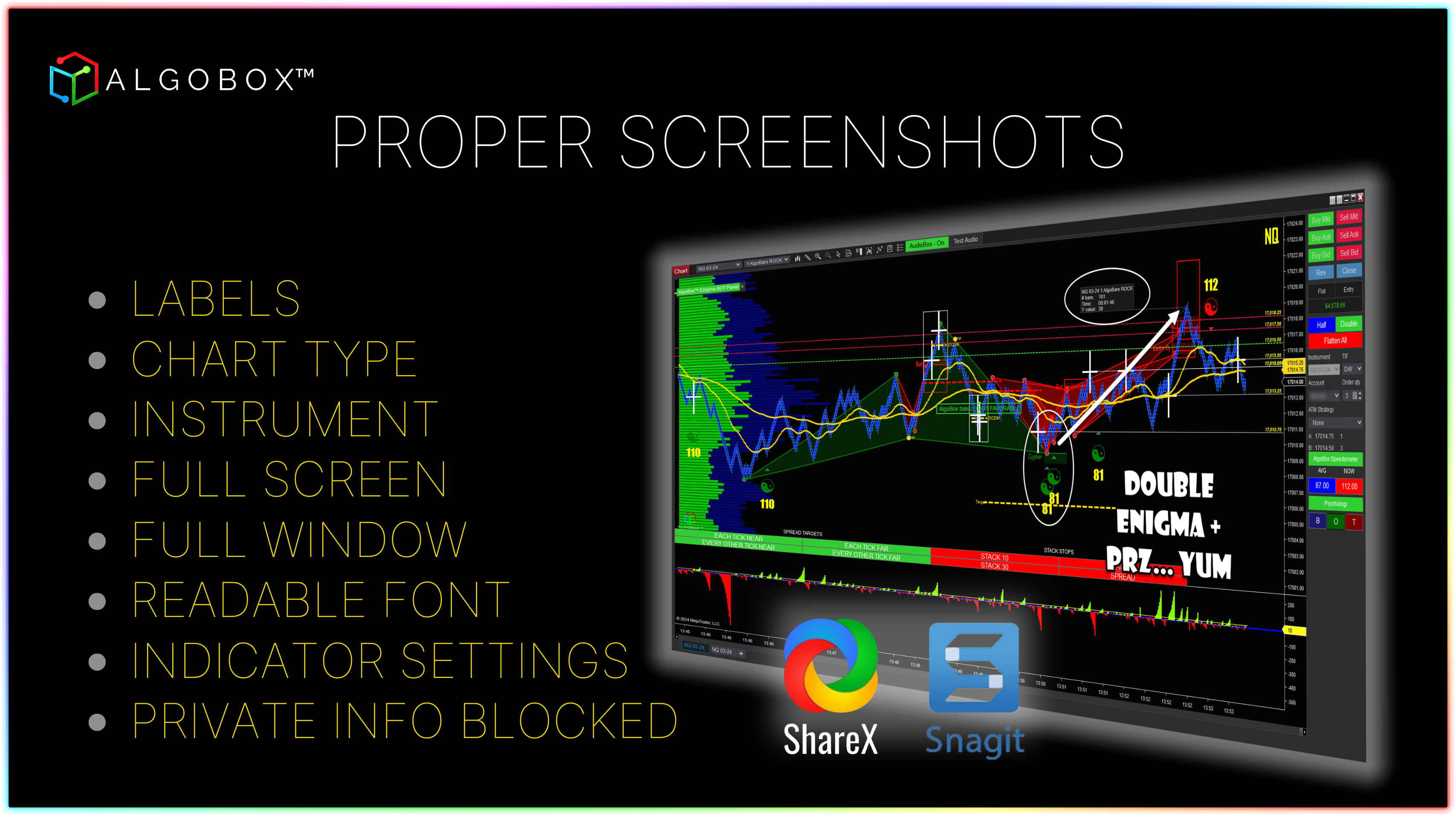 <figure><img src="https://3588932008-files.gitbook.io/~/files/v0/b/gitbook-x-prod.appspot.com/o/spaces%2FSmdQdlKTkpiw2LN0L1TV%2Fuploads%2FszaJA6atbJIEQoEVcQNx%2FProper%20Screenshots.png?alt=media&#x26;token=ceb4f1ed-a7b5-4877-9450-9f3e48dd8b1a" alt=""><figcaption><p>Proper screenshots are essential when explaining technical issues or trading ideas, allowing AlgoBox™ Tech Support and members to provide excellent support and insightful feedback.</p></figcaption></figure>