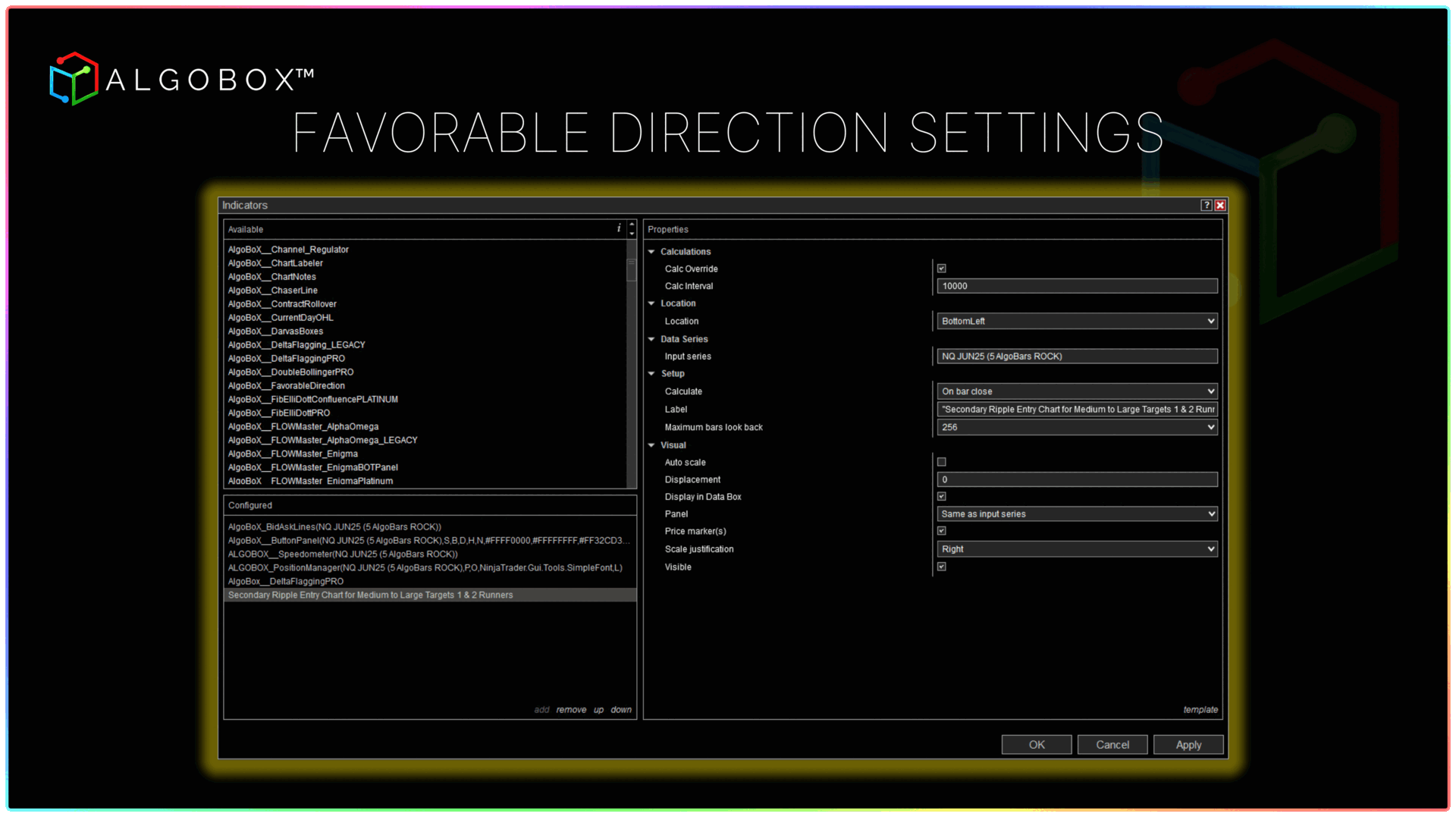 <figure><img src="https://3588932008-files.gitbook.io/~/files/v0/b/gitbook-x-prod.appspot.com/o/spaces%2FSmdQdlKTkpiw2LN0L1TV%2Fuploads%2FcMWfMrl1EDMDY4nxzcV8%2FFav%20direction%20settings%20gif.gif?alt=media&#x26;token=7f5973f7-2d13-4c56-b716-c7de2dec0e8f" alt=""><figcaption><p>The Favorable Direction indicator offers a variety of customizable settings, allowing you to adjust them according to your preferences. Default AlgoBox™ settings are shown.</p></figcaption></figure>