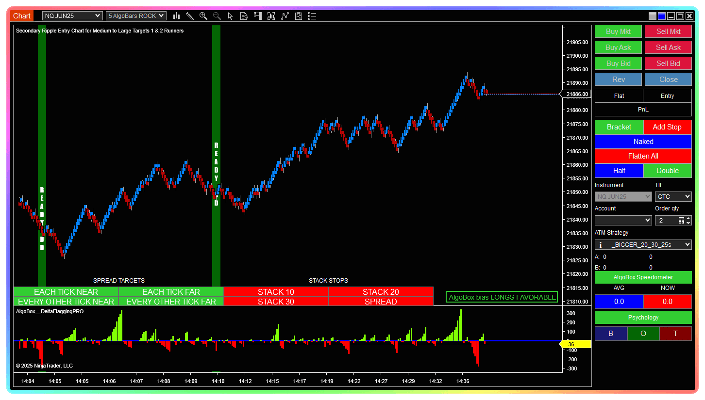 Conversely, when price is above the open line, a <mark style="color:green;">green</mark> banner reading “<mark style="color:green;">AlgoBox Bias LONGS FAVORABLE</mark>” appears, indicating current and/or potential upward bias. This at-a-glance directional context can be useful for aligning trades with broader intraday trends.