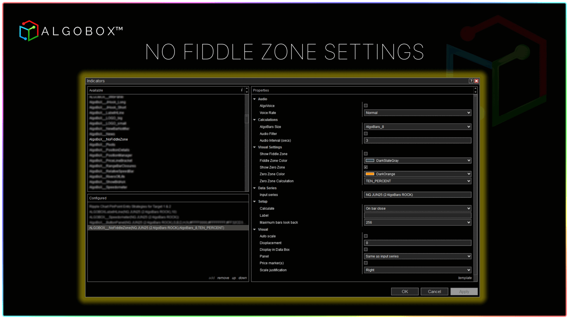 <figure><img src="https://3588932008-files.gitbook.io/~/files/v0/b/gitbook-x-prod.appspot.com/o/spaces%2FSmdQdlKTkpiw2LN0L1TV%2Fuploads%2FOJX2aY9uyKD4GxwobVer%2FNo%20Fiddle%20Zone%20Settings%20gif.gif?alt=media&#x26;token=03bb29c6-5c49-438e-9b1b-638f40580d8d" alt=""><figcaption><p>The AlgoBox™ No Fiddle Zone indicator offers a variety of customizable settings, allowing you to adjust them according to your preferences. Default AlgoBox™ settings are shown.</p></figcaption></figure>