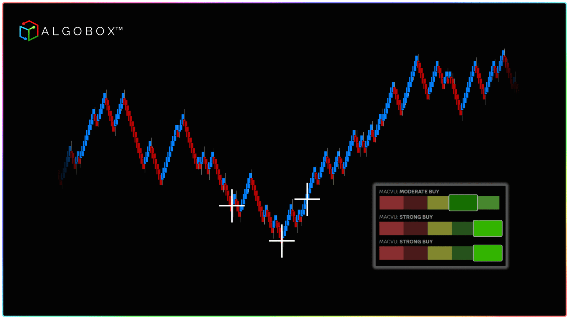 <figure><img src="https://3588932008-files.gitbook.io/~/files/v0/b/gitbook-x-prod.appspot.com/o/spaces%2FSmdQdlKTkpiw2LN0L1TV%2Fuploads%2FviozaceatdcAOwx3aZHA%2F3%20kings%20buy%20.gif?alt=media&#x26;token=e1213b4c-d23a-4228-8d7f-c093f449c42f" alt=""><figcaption><p>Here we see three FlowMaster™ Crosses plotted in close proximity, combined with the MACVU's Moderate and Strong Buy signals, indicating a potential move upwards.</p></figcaption></figure>