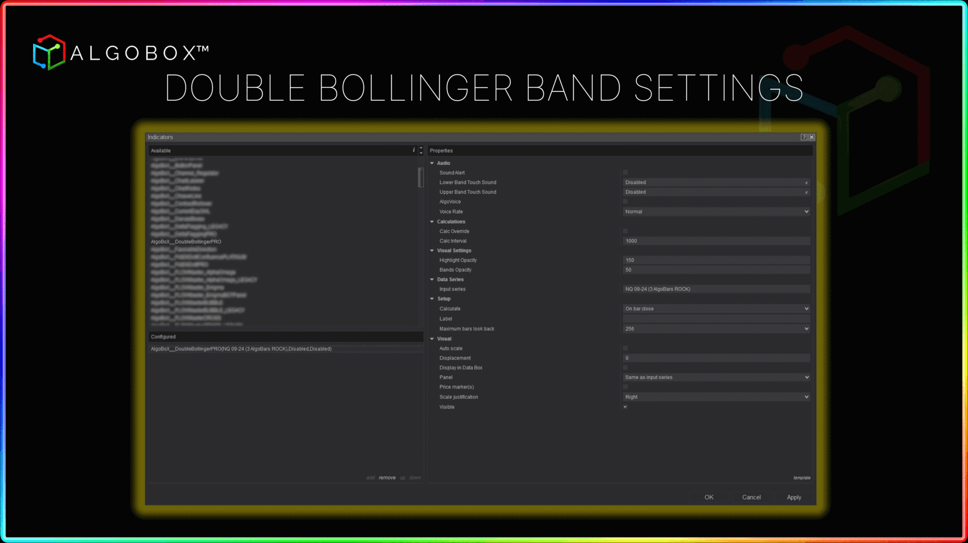 <figure><img src="https://3588932008-files.gitbook.io/~/files/v0/b/gitbook-x-prod.appspot.com/o/spaces%2FSmdQdlKTkpiw2LN0L1TV%2Fuploads%2Ft9DbgyukNkD0XKKnHMJk%2FBolinger%20Bands%20settings.gif?alt=media&#x26;token=959930c0-f327-4373-89a0-0d6edc5b0f6d" alt=""><figcaption><p>The Double Bollinger Pro offers a variety of customizable settings, allowing you to adjust them according to your preferences. Default AlgoBox™ settings are shown.</p></figcaption></figure>