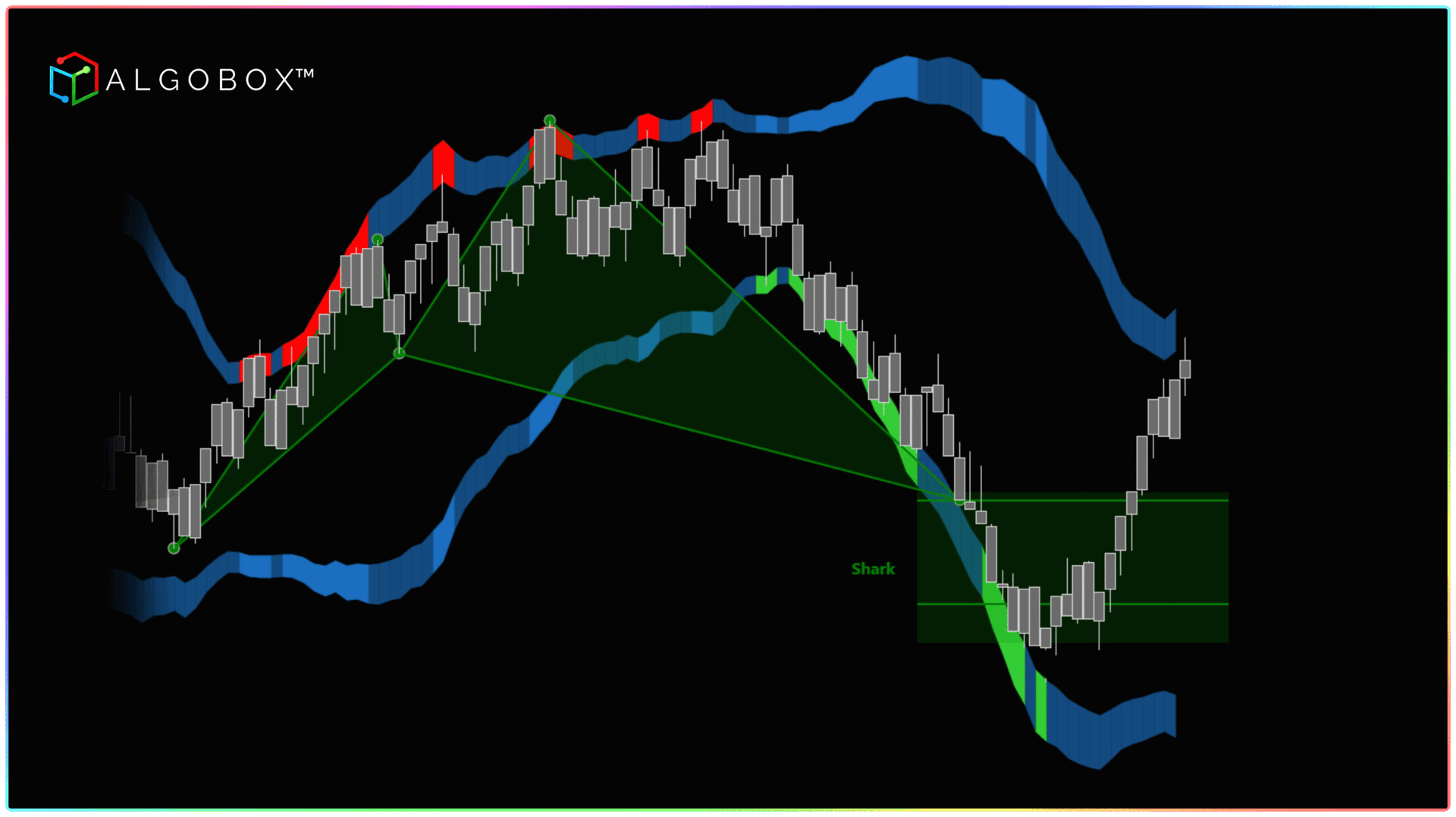 <figure><img src="https://3588932008-files.gitbook.io/~/files/v0/b/gitbook-x-prod.appspot.com/o/spaces%2FSmdQdlKTkpiw2LN0L1TV%2Fuploads%2FvRD2ULZYJp7pUB7F6YdC%2FBolinger%20Bands%20shark%20GIF%201.gif?alt=media&#x26;token=34d924fd-6a96-4294-9494-27d9cb2e7c7c" alt=""><figcaption><p>A green Shark Harmonic Pattern plotted at the touch of the lower Bollinger Bands could indicate a potential upward move, signaling a possible opportunity for long positions.</p></figcaption></figure>